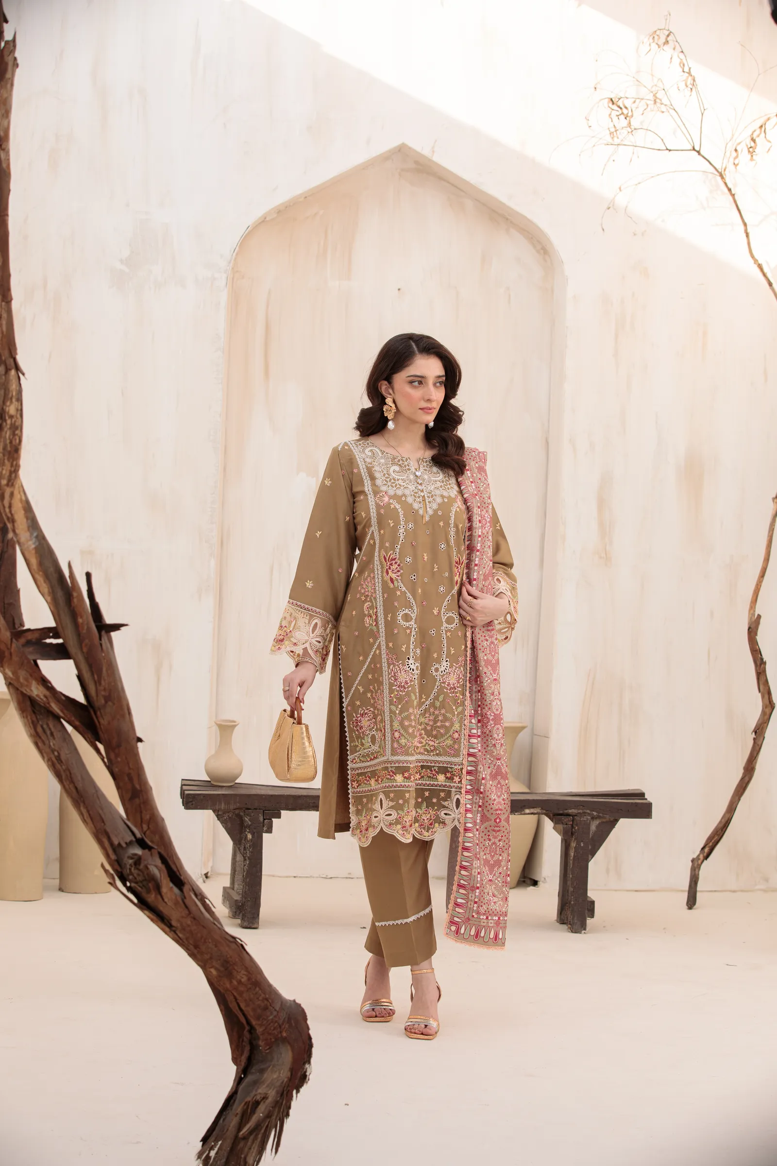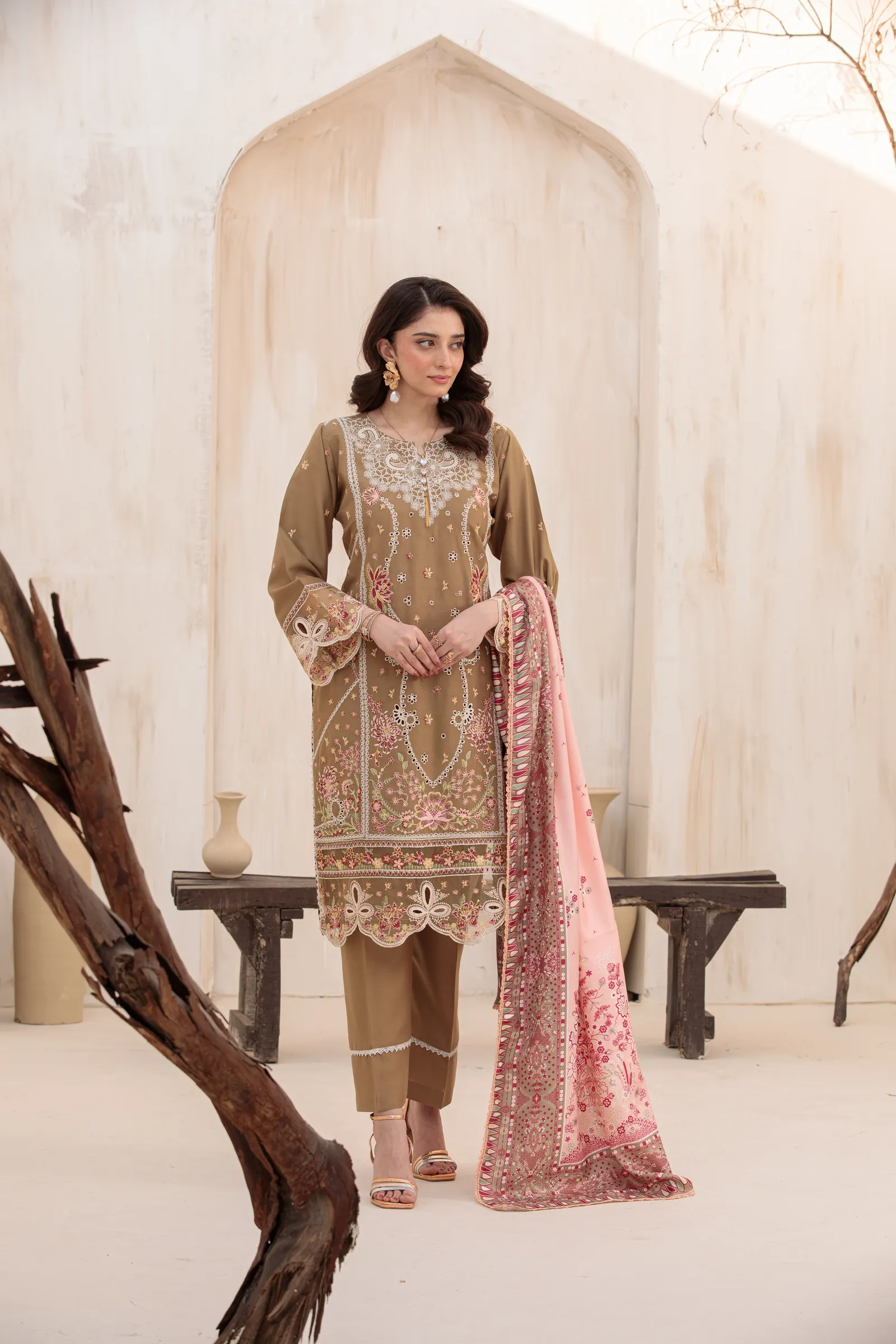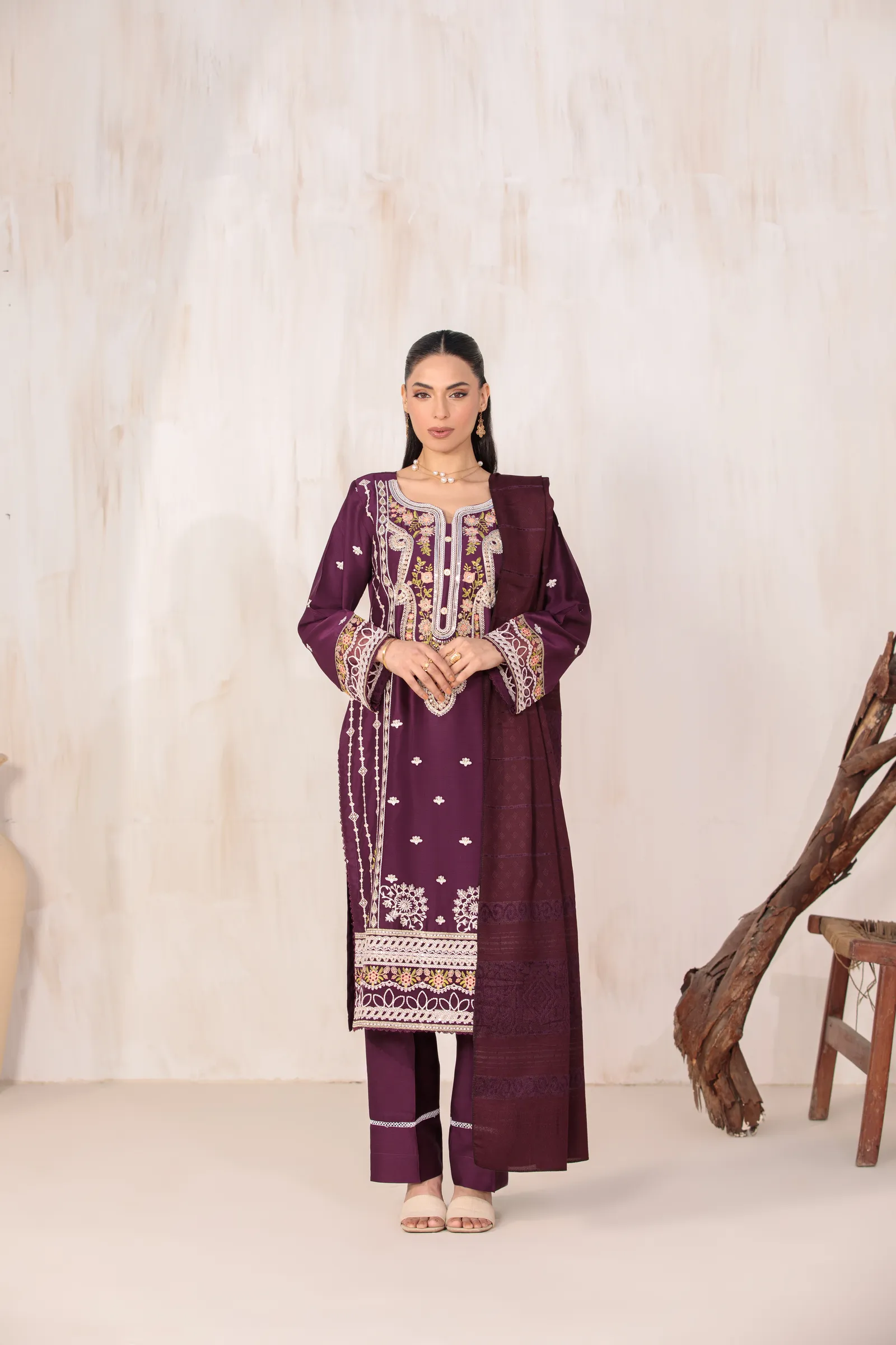 3 Piece Lillen Suit – Embroidered with Shawl (Stitched)