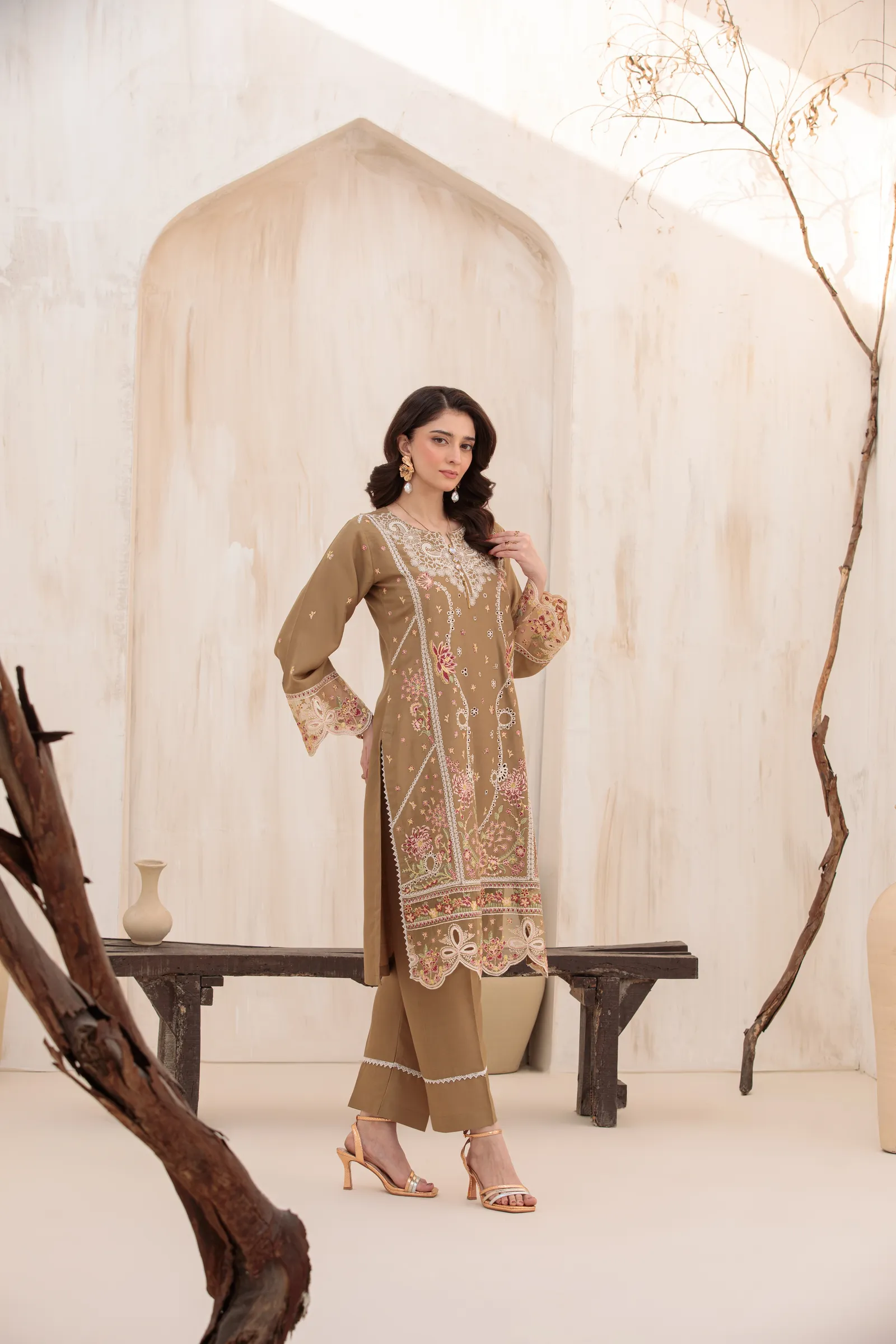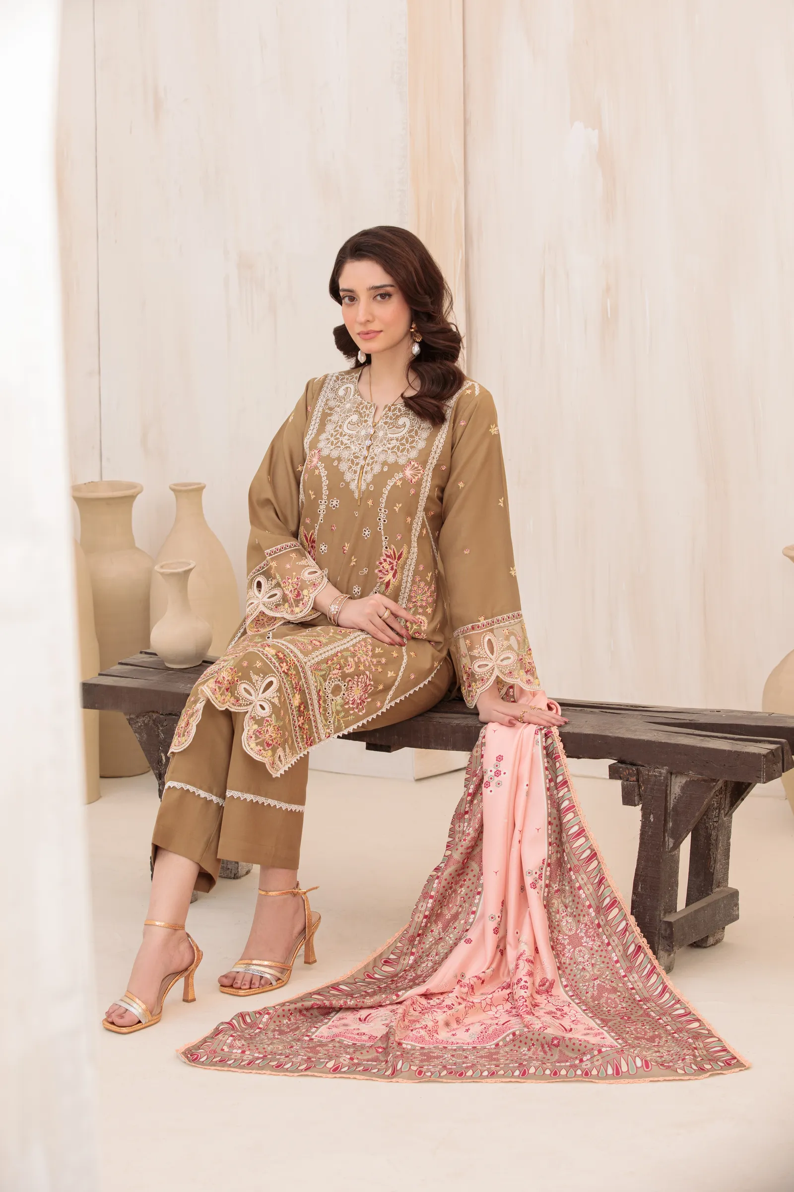 A hand-made, premium-quality Dhanak 3-piece suit featuring delicate embroidery and a matching shawl.