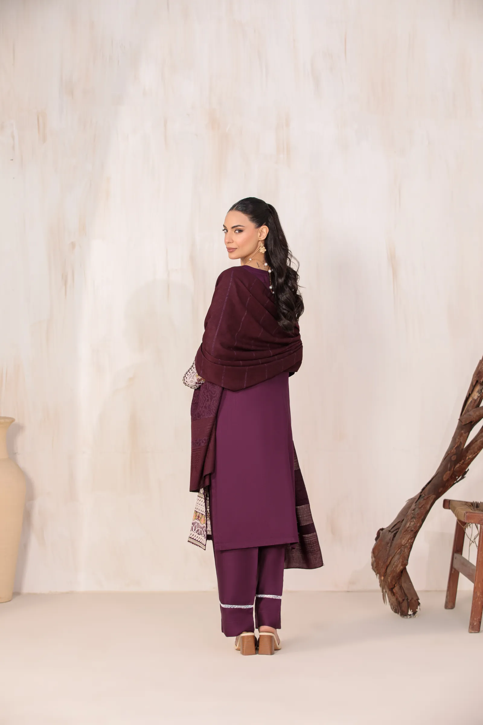 A hand-made, premium-quality Dhanak 3-piece suit featuring delicate embroidery and a matching shawl.