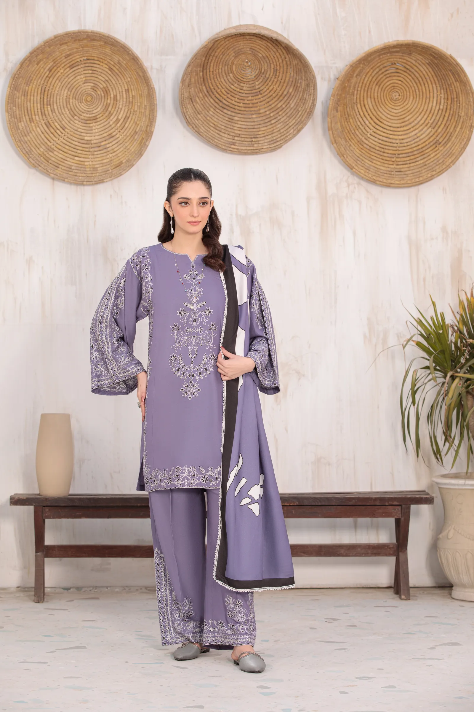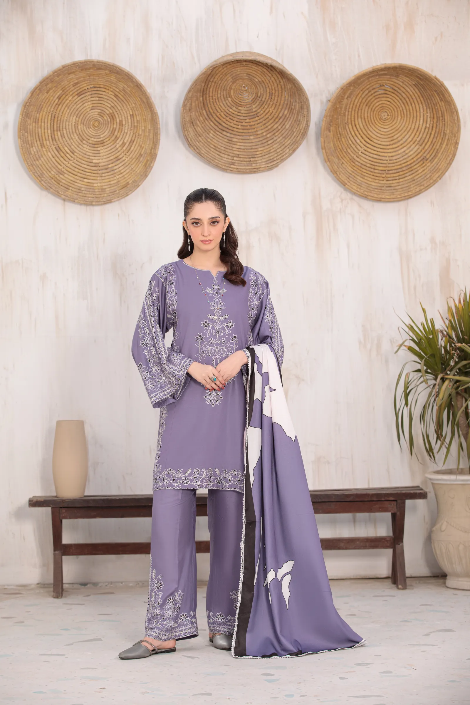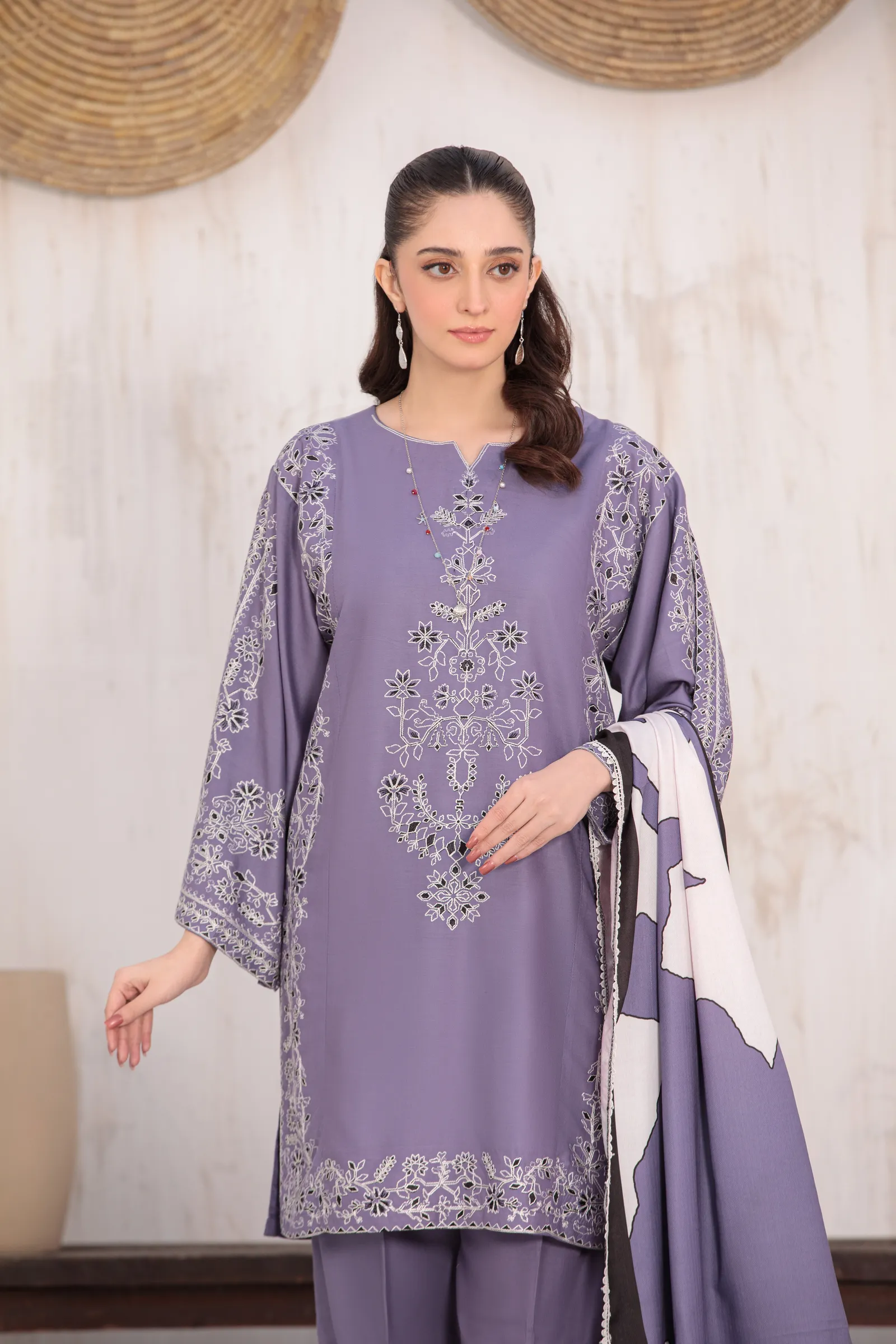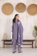 A hand-made, premium-quality Lillen 3-piece suit featuring delicate embroidery and a matching shawl.