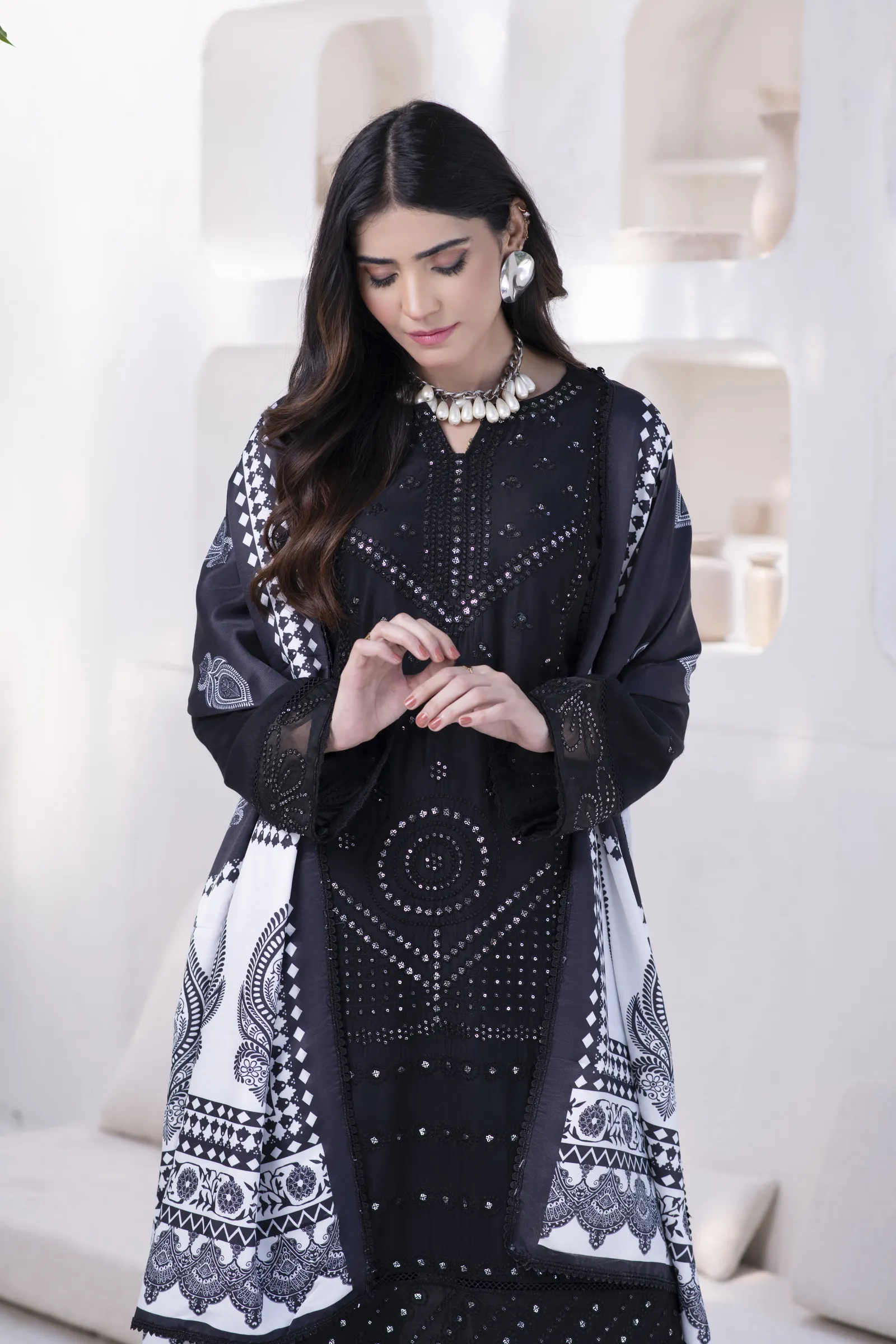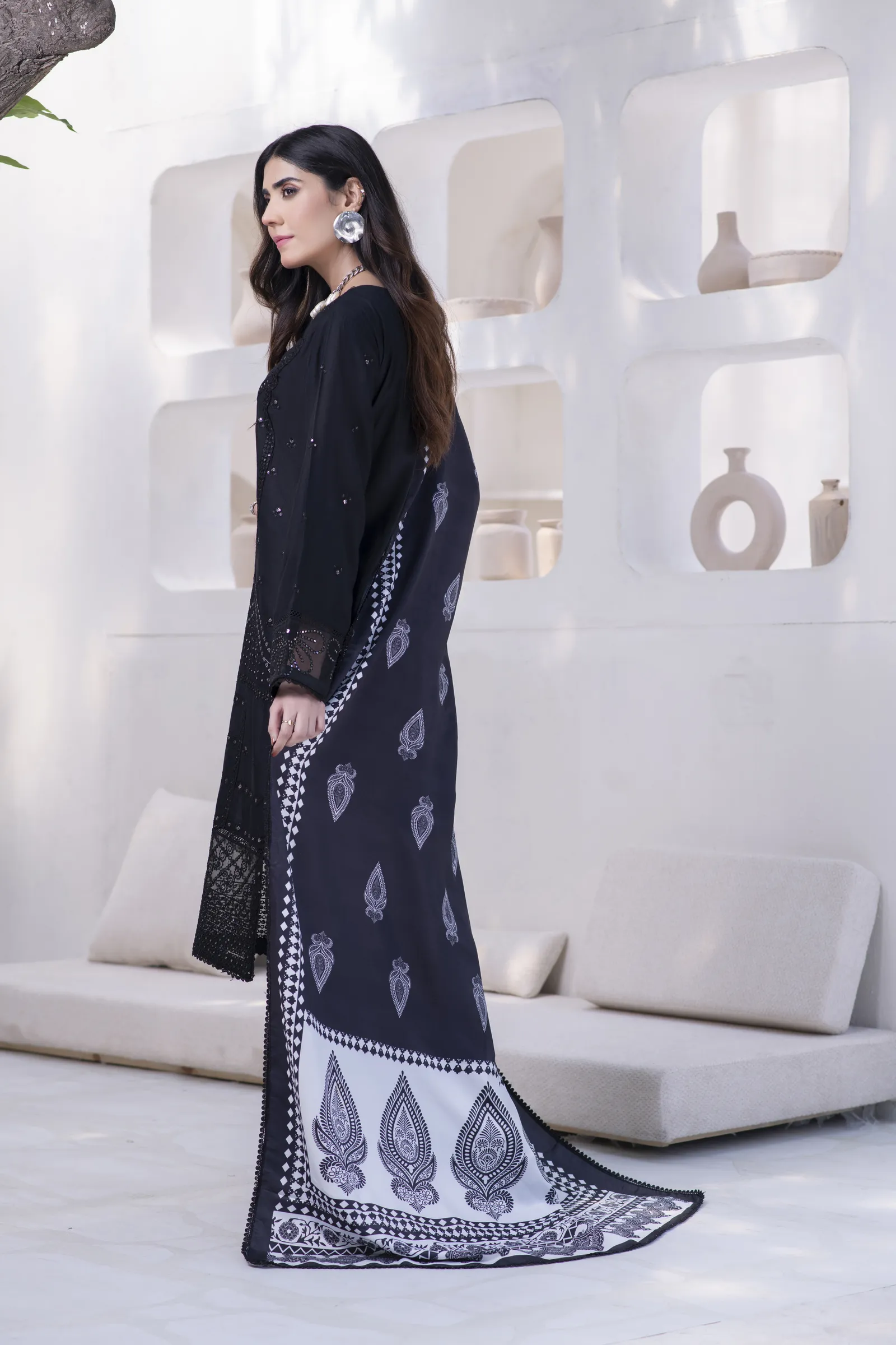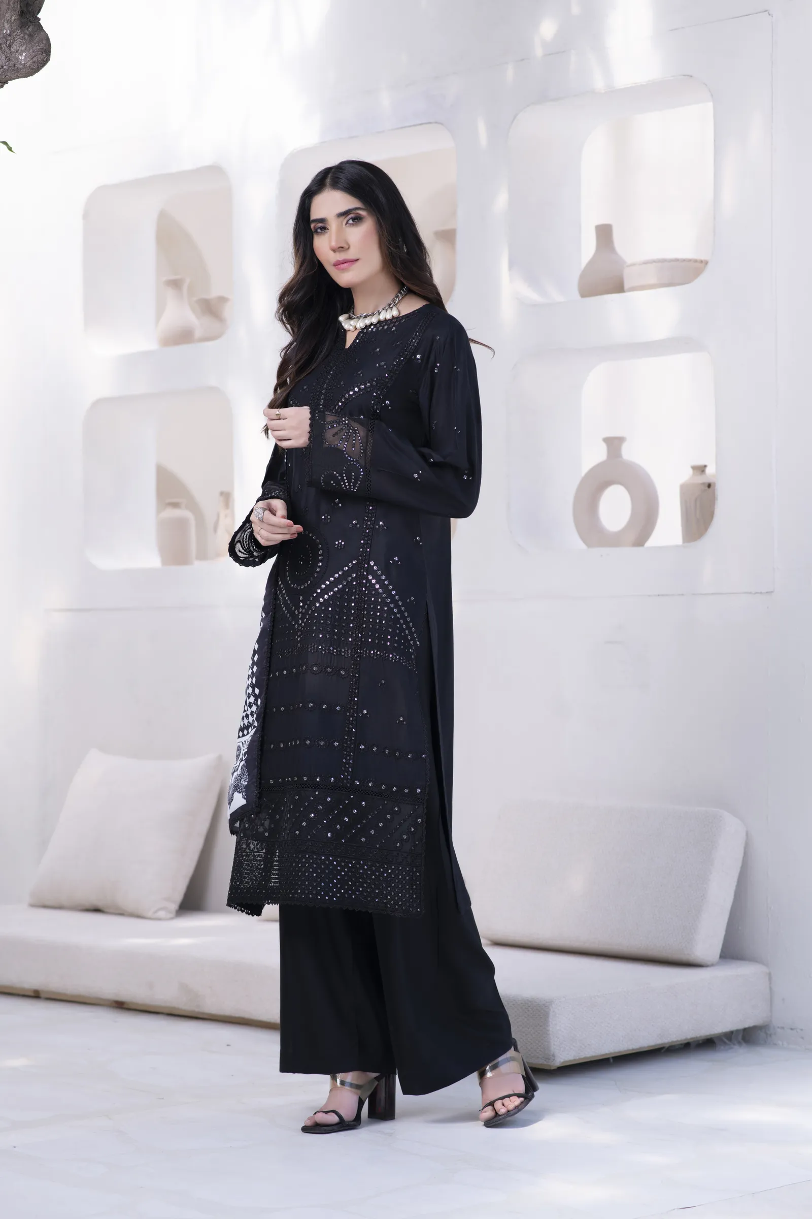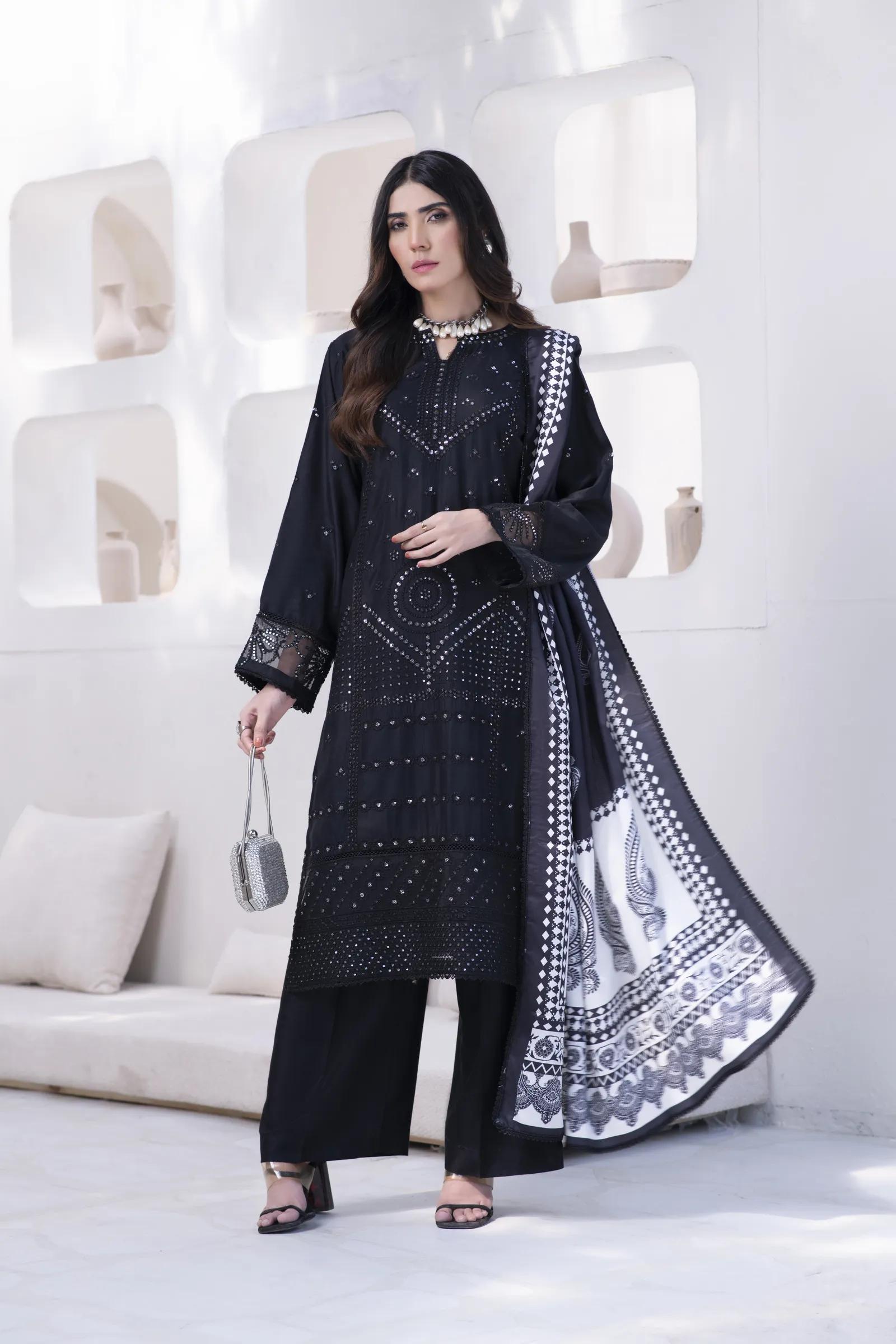A hand-made, premium-quality Lillen 3-piece suit featuring delicate embroidery and a matching shawl.