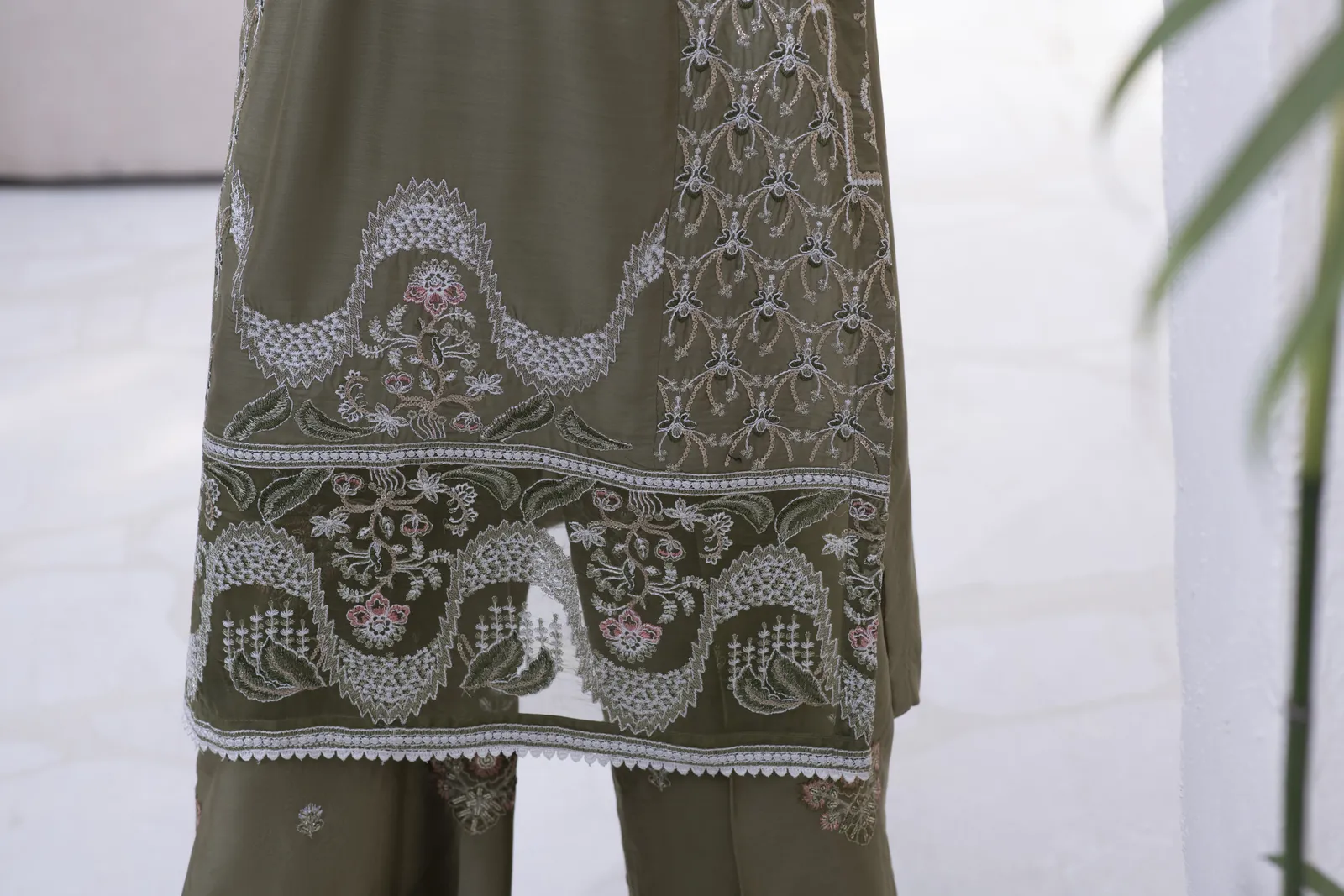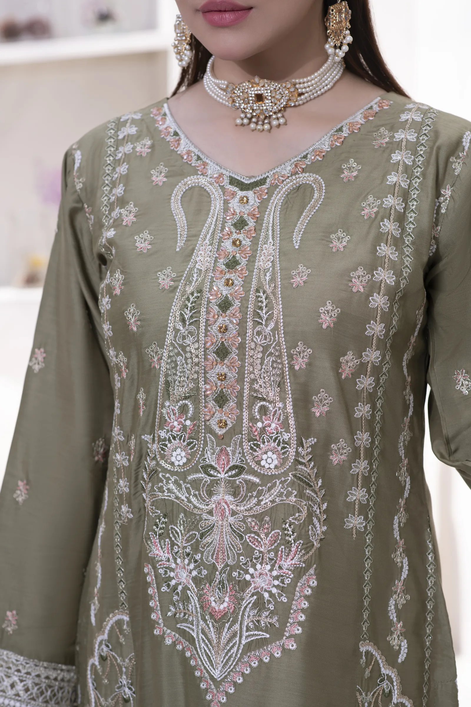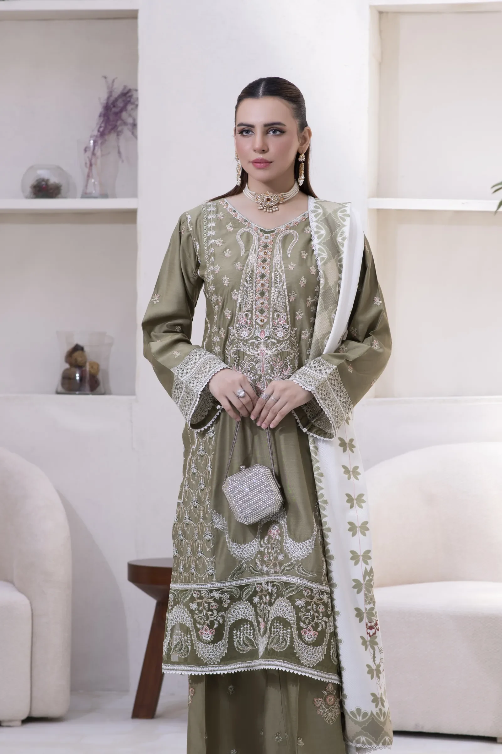 A hand-made, premium-quality Viscos 3-piece suit featuring delicate embroidery and a matching shawl.