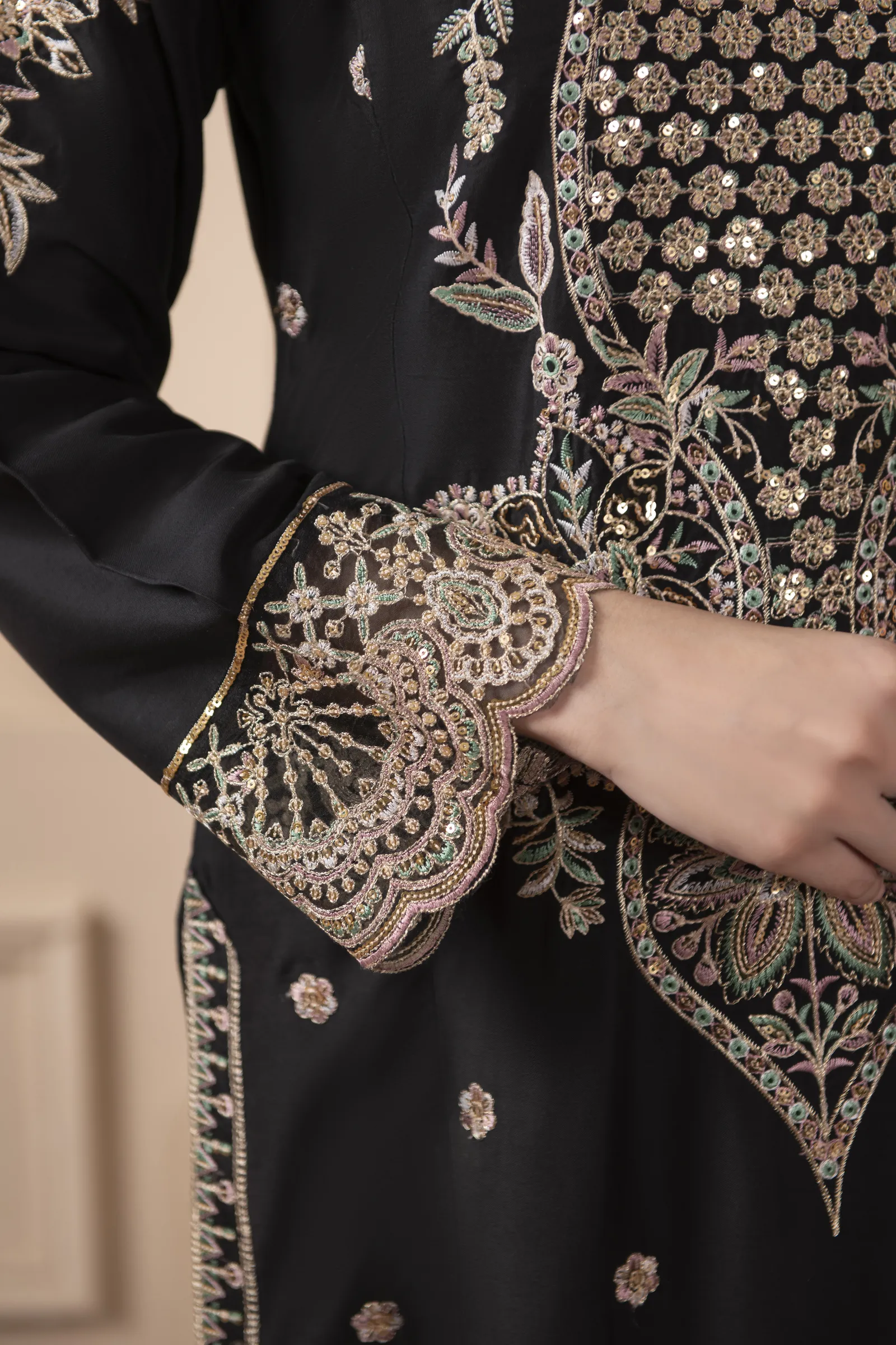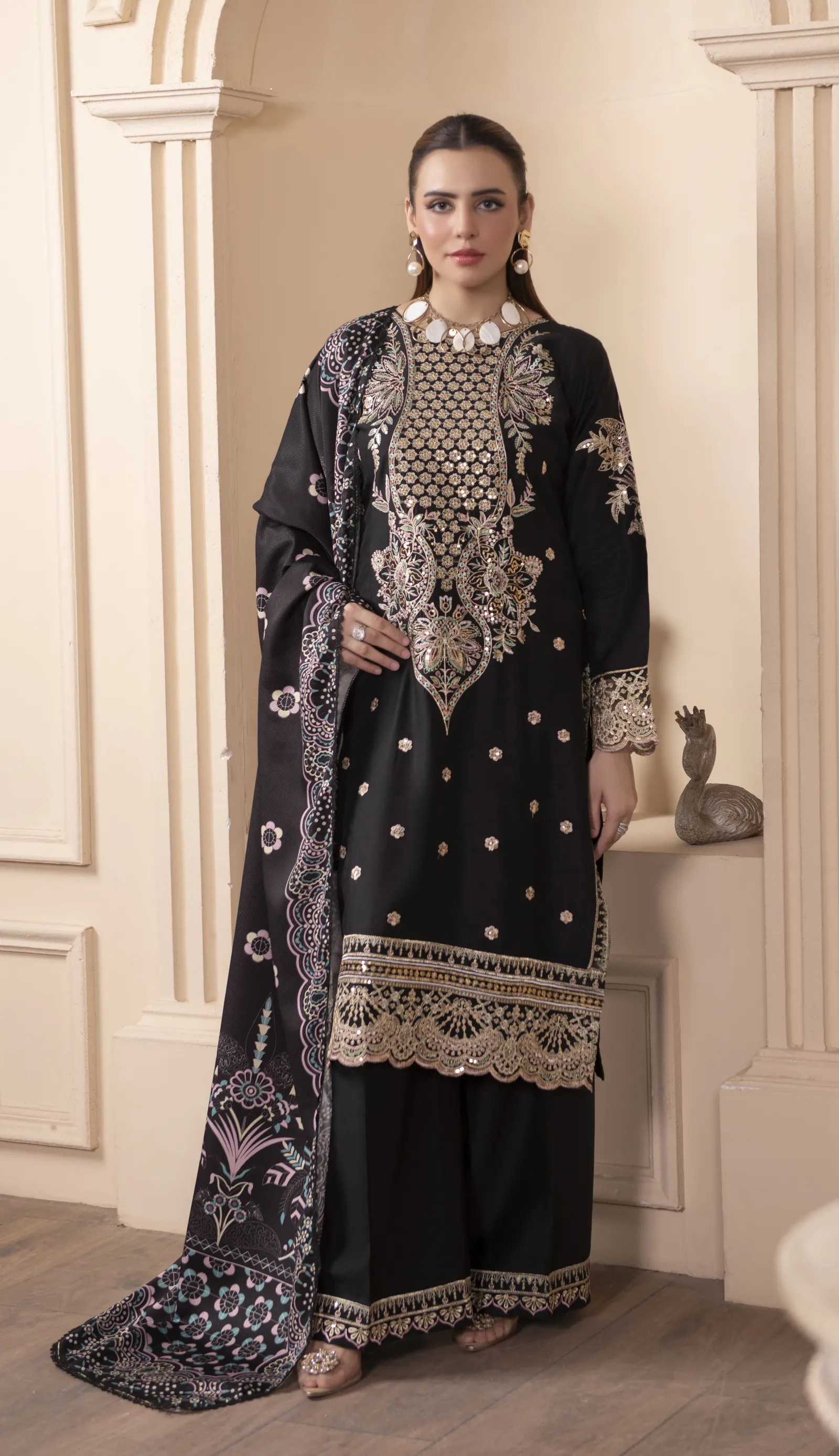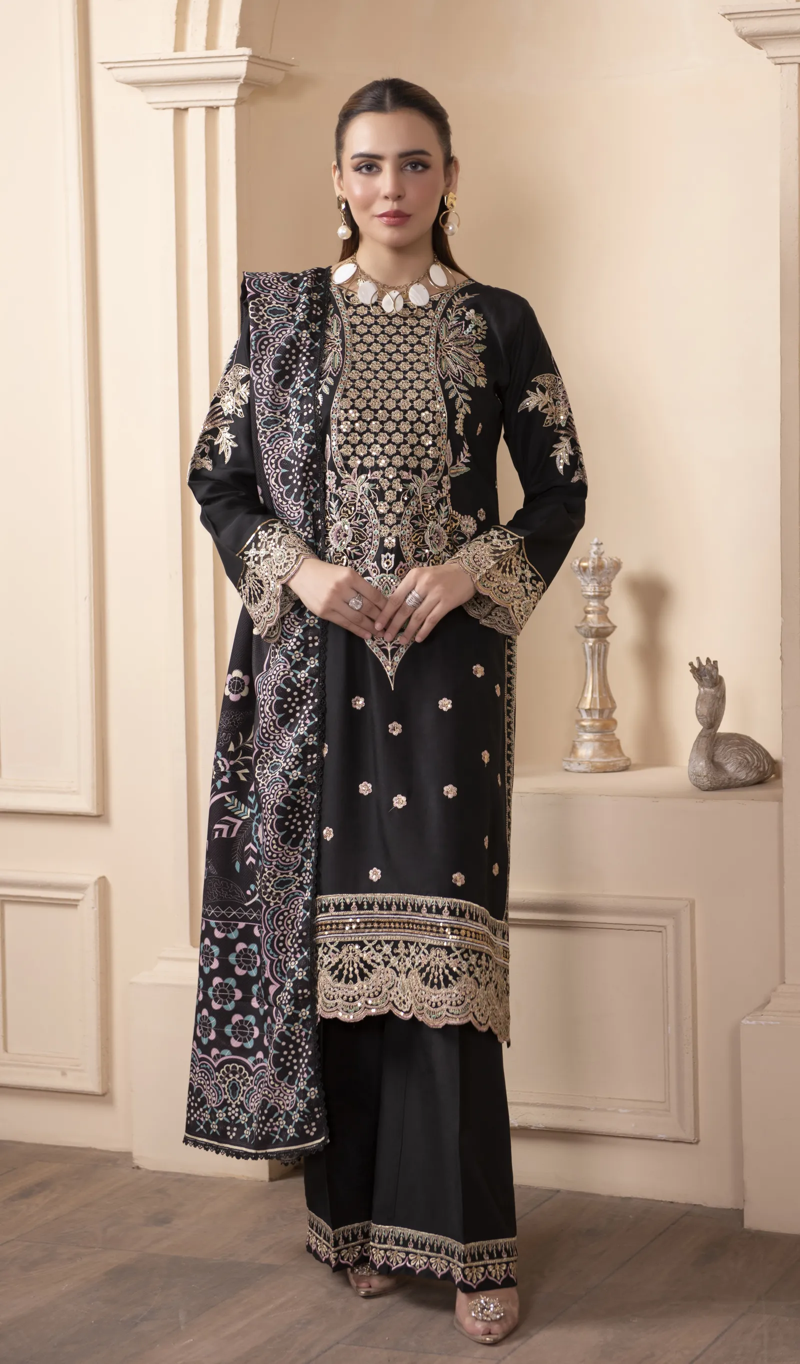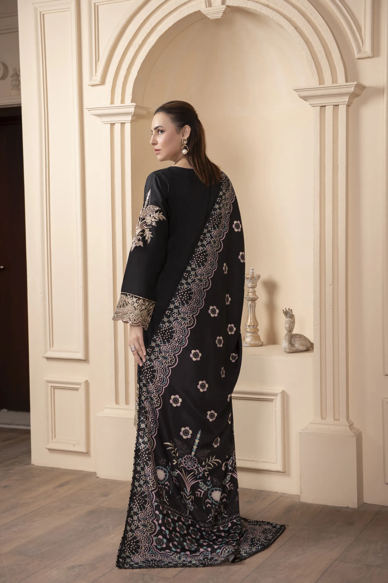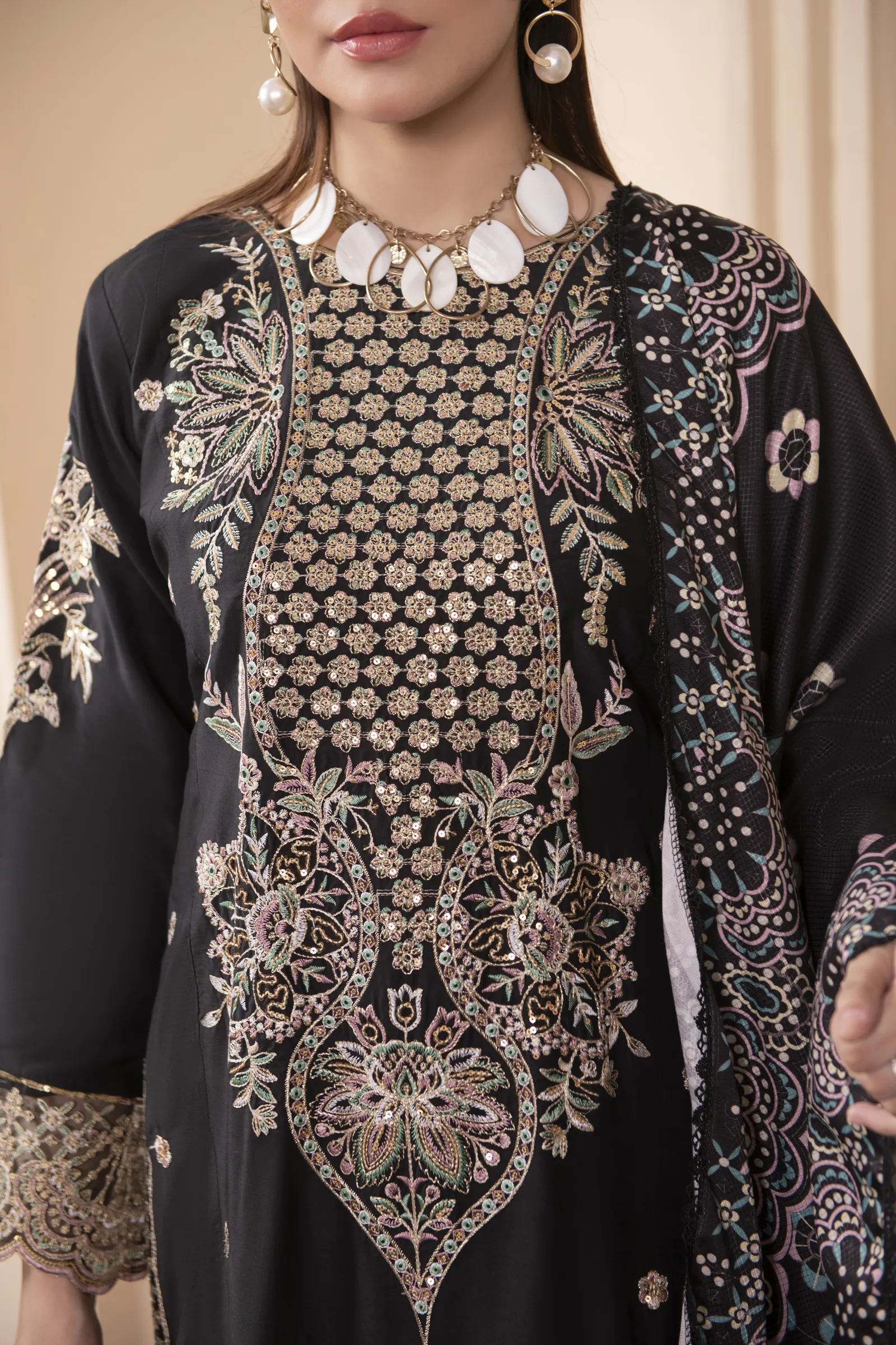 A hand-made, premium-quality Viscos 3-piece suit featuring delicate embroidery and a matching shawl.
