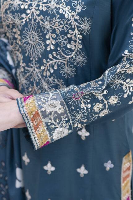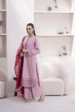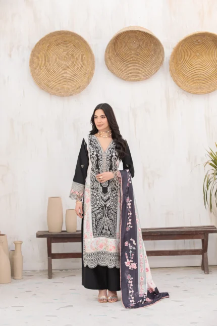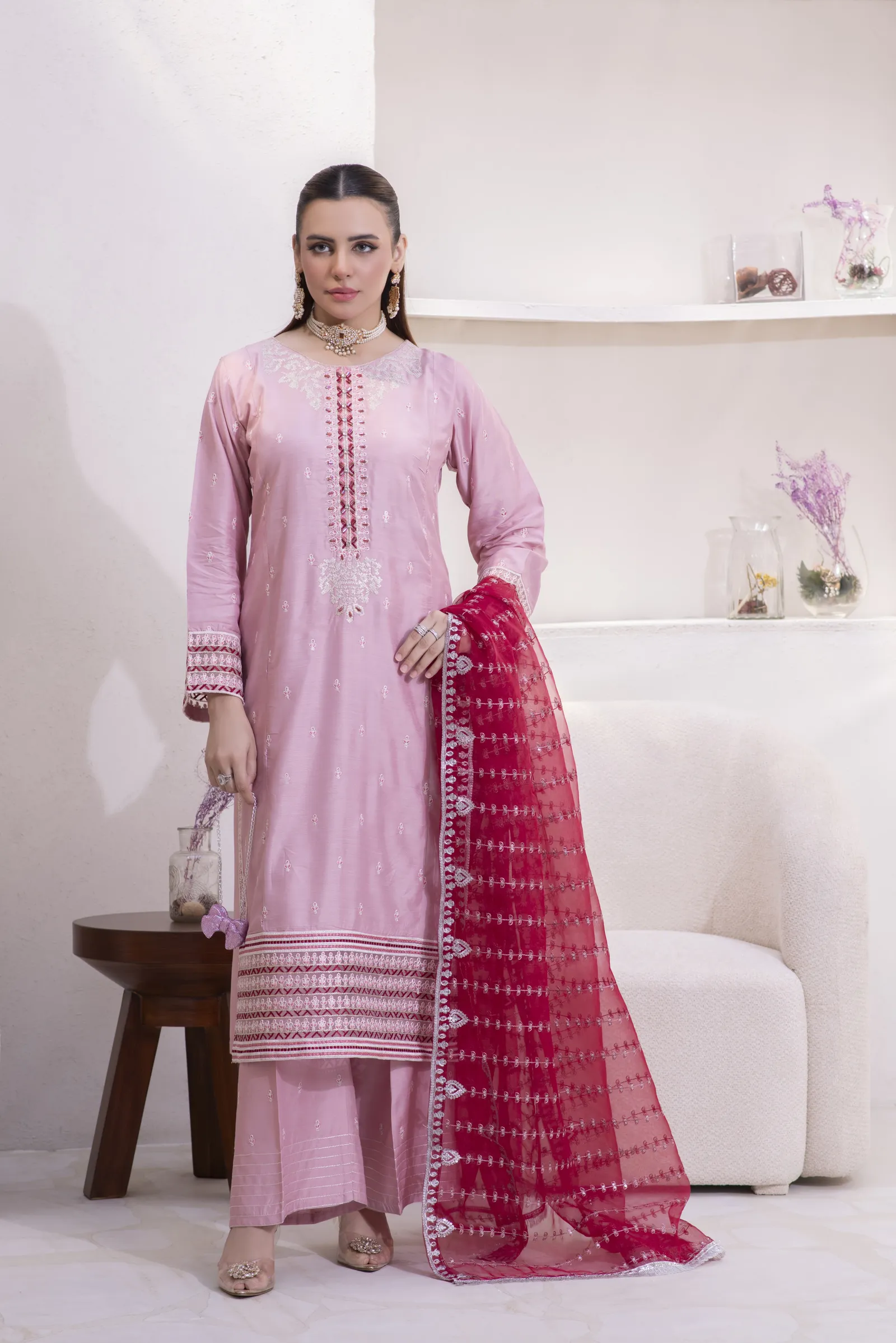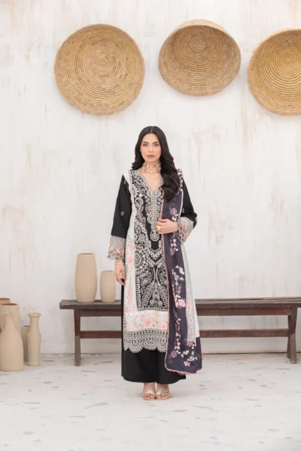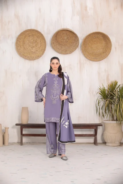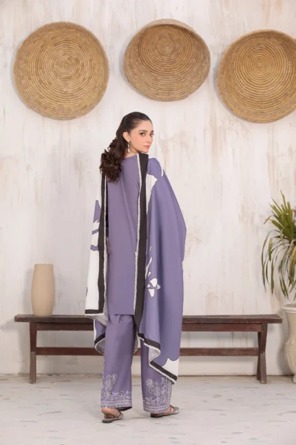 A hand-made, premium-quality Viscos 3-piece suit featuring delicate embroidery and a matching shawl.