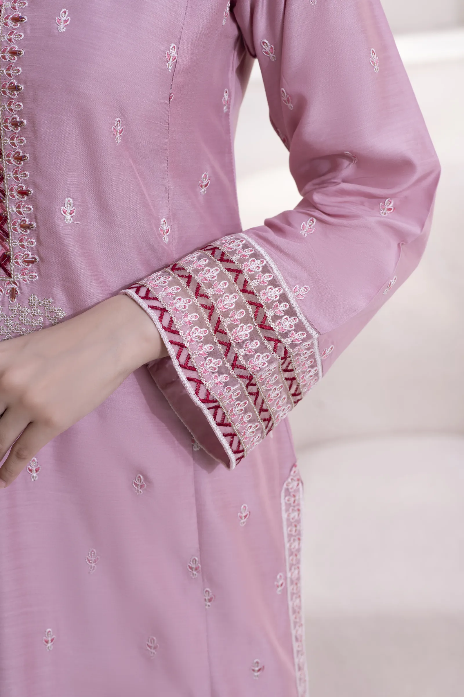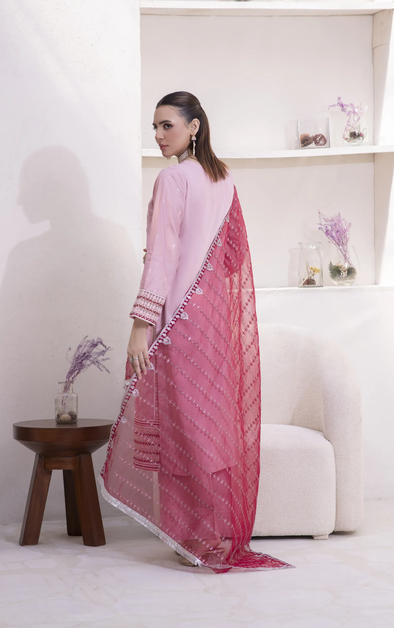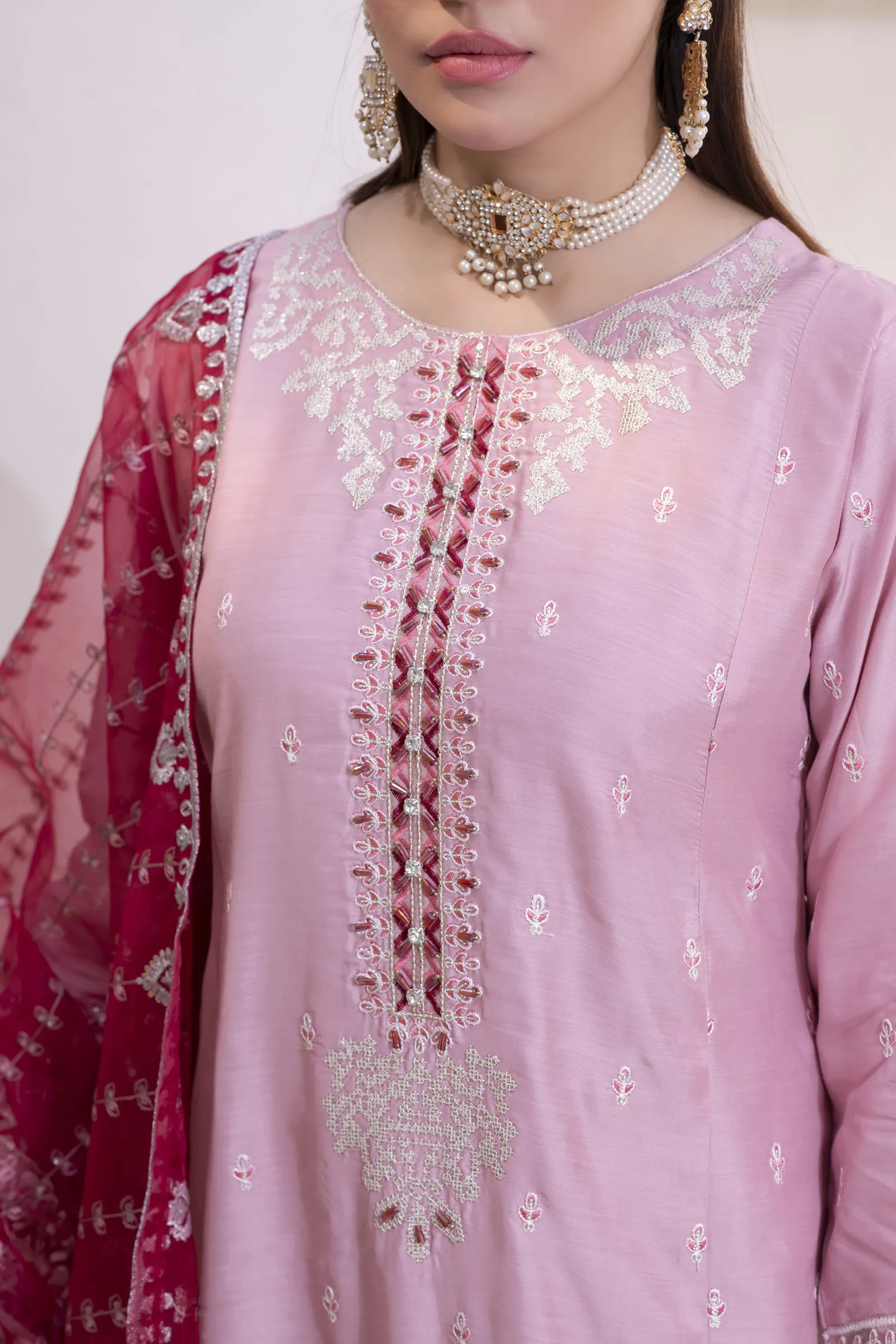 A hand-made, premium-quality Viscos 3-piece suit featuring delicate embroidery and a matching shawl.